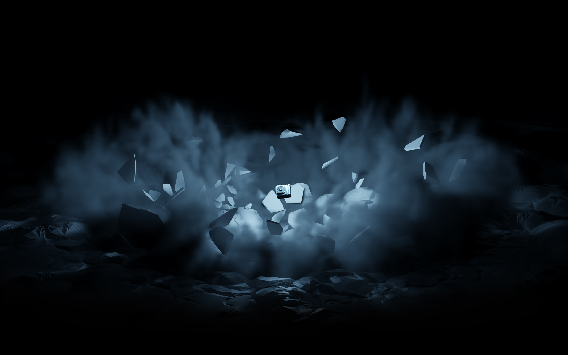 Above left: First test of Rigid Body Dynamic simulation using a whole bunch of methods: Fractured mesh, displacement with video files and proximity based displacement in the shader. To the right is an impact test still render with the addition of simulated smoke to add dust and weight to the scene as it looked a little bare. Smoke sim also took a few hours to bake even though only lasted for about 5 seconds.